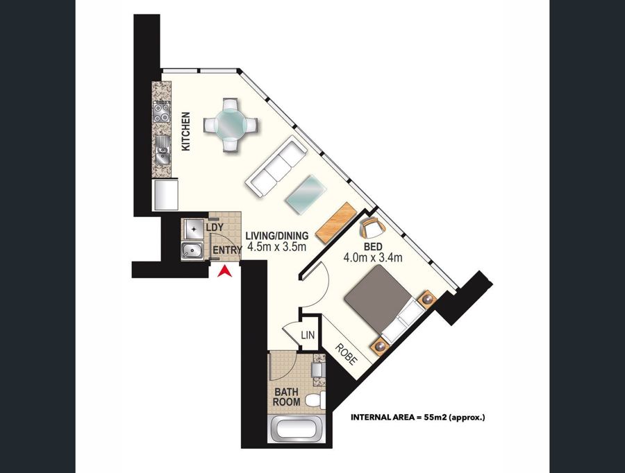 - Executive one-bedroom, one-bathroom apartment located on the 4th floor of Soleil by Meriton.